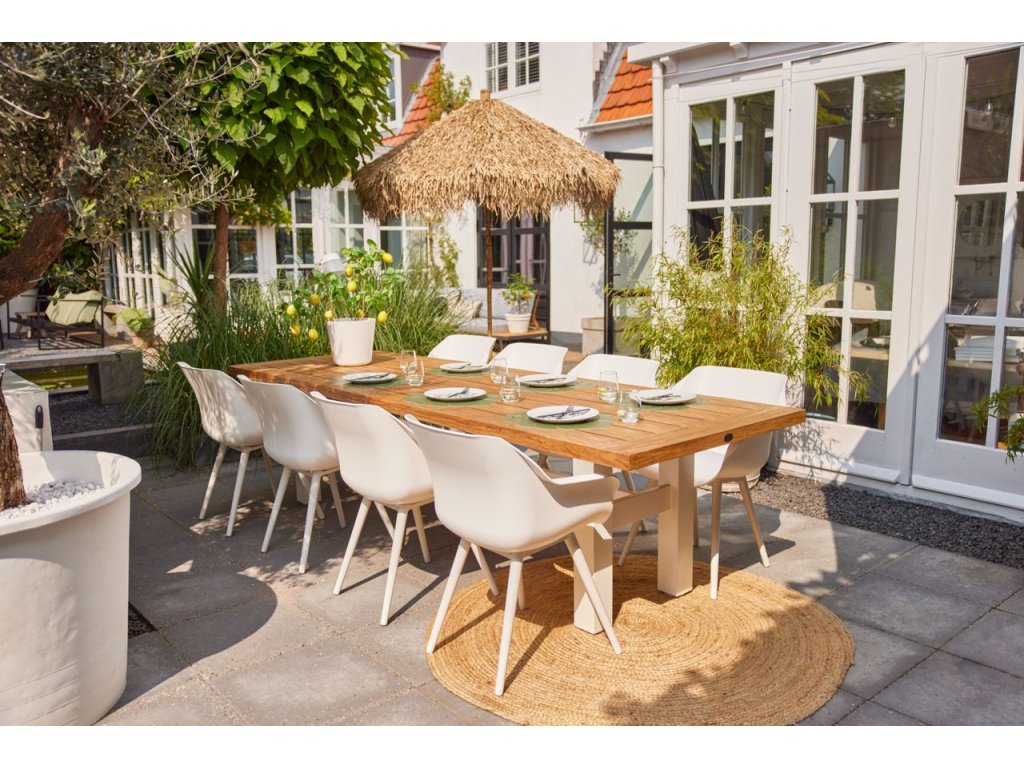 Stůl je vyroben z teakového dřeva a je neuvěřitelně bytelný a odolný. Teak má lehce našedlou barvou, která je pro něj přirozená a v průběhu času ještě lehce zesvětlá. Pokud chcete udržet stejnou barvu dřeva, můžete stůl ošetřit nátěrem. Tento materiál je také velmi odolný vůči různým povětrnostním vlivům a nepřízni počasí. Díky tomu může stůl zůstat venku po celý rok.