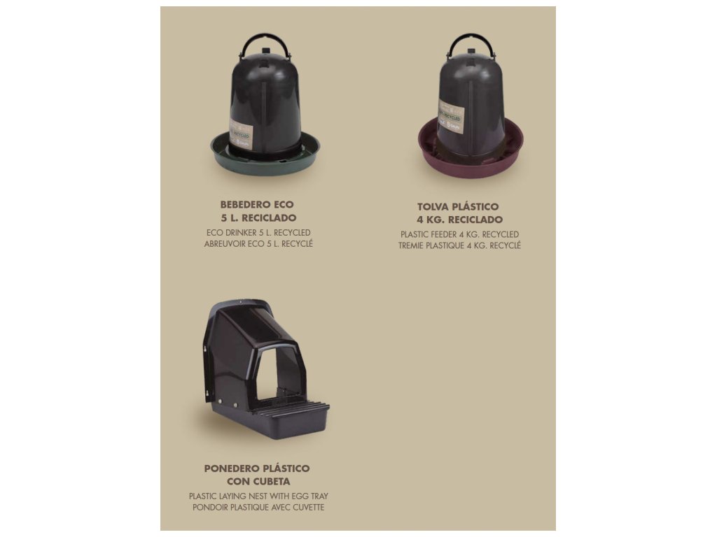 Základní sada pro začínající chovatele nosnic - EKO Plastové Snáškové hnízdo Standard, EKO Krmítko 4 kg a EKO Napáječka 5 litrů. EKO verze vyrobená z recyklovaných materiálů. Vyrobeno v EU.