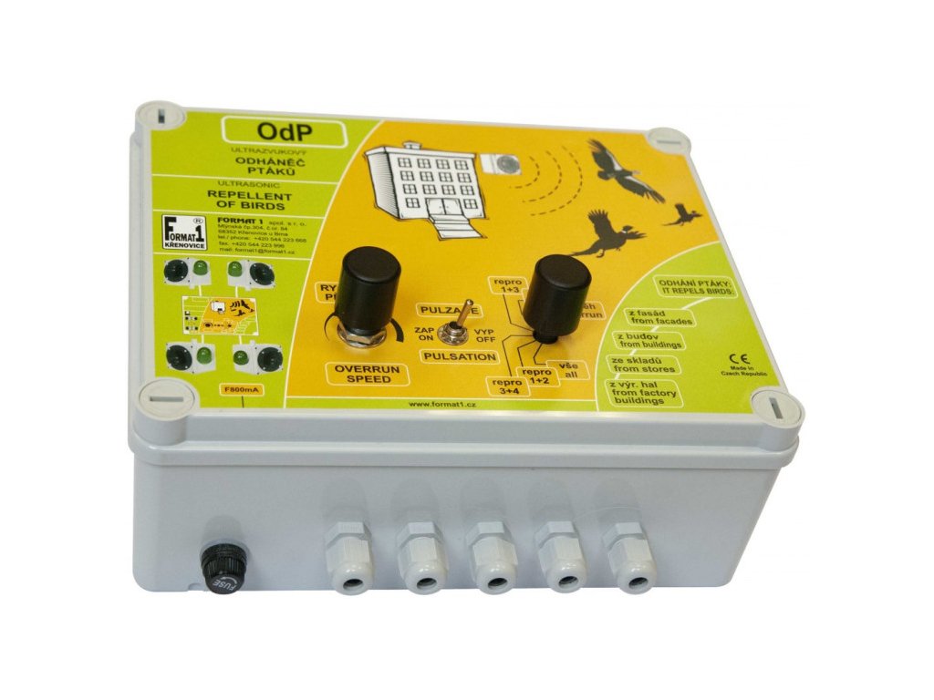 Kompletní sestava odháněče ptáků se 4 reproduktory. Účinná ochrana budov, zateplení fasád, hal, sil apod. Vysílá ultrazvukové vlny přelaďovaných kmitočtů, které lidé neslyší, ale ptáci je vnímají jako velice nepříjemné. Vhodný k použití v prostorách zcela, nebo alespoň částečně uzavřených (výrobní haly, obchodní domy, letištní plochy, hangáry, stadiony, obilná sila apod.).
